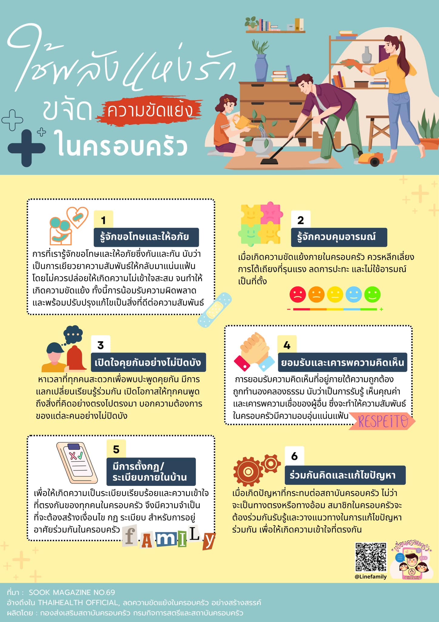 ปัญหาครอบครัวจากความขัดแย้งระหว่างสมาชิกภายในบ้านเป็นเรื่องที่สามารถเกิดขึ้นได้ จึงจะต้องมีการป้องกันปัญหาความขัดแย้ง ที่อาจะบานปลายจนกระทบต่อสัมพันธภาพในครอบครัว ซึ่งจะนำไปสู่ปัญหาช่องว่างระหว่างวัย การหย่าร้าง รวมถึงปัญหาการใช้ความรุนแรงในครอบครัว ไม่ว่าจะเป็นทางด้านร่างกายและจิตใจ ดังนั้น เพื่อให้การสื่อสารในครอบครัวเป็นไปอย่างสร้างสรรค์ เพื่อนครอบครัว : Family Line ขอเสนอ "6 วิธี การรับมือกับความขัดแย้งในครอบครัว" เพื่อให้ทุกครอบครัวมีสายสัมพันธ์ที่แน่นแฟ้น
