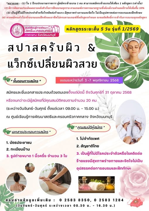 เปิดรับสมัครหลักสูตรระยะสั้น 5 วัน รุ่นที่ 1 ประจำปีงบประมาณ 2569 (สปาสครับผิว&แว็กซ์เปลี่ยนผิวสวย) จำนวน 20 คน