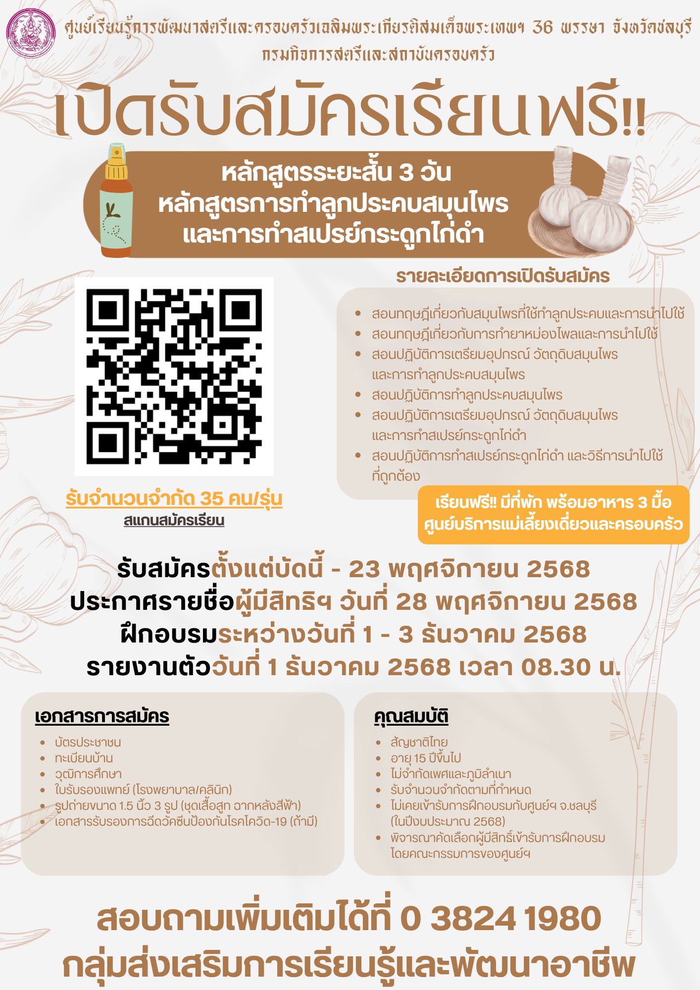 รายละเอียดการเปิดรับสมัคร หลักสูตรการทำลูกประคบสมุนไพร และการทำสเปรย์กระดูกไก่ดำ (รับจำนวน 35 คน/รุ่น)