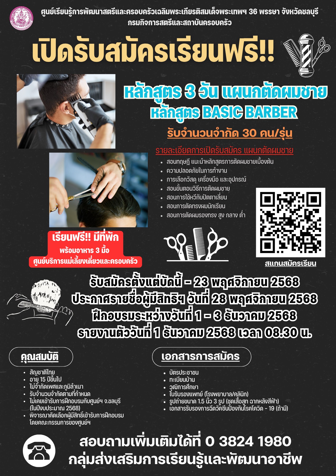 รายละเอียดการเปิดรับสมัคร แผนกตัดผมชาย หลักสูตร Basic Barber (รับจำนวน 30 คน/รุ่น)