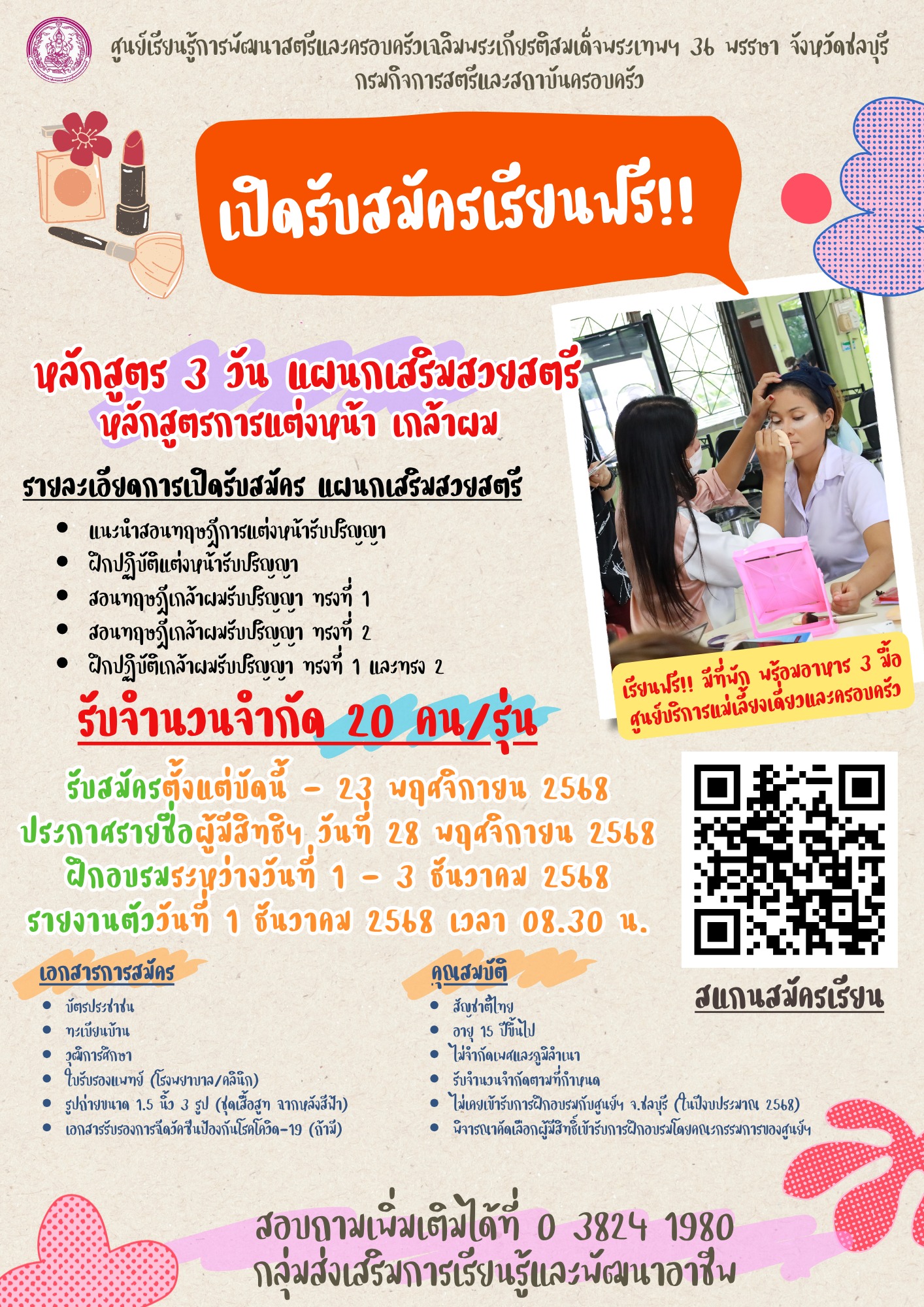 รายละเอียดการเปิดรับสมัคร แผนกเสริมสวยสตรี หลักสูตรการแต่งหน้า เกล้าผม (รับจำนวน 20 คน/รุ่น)