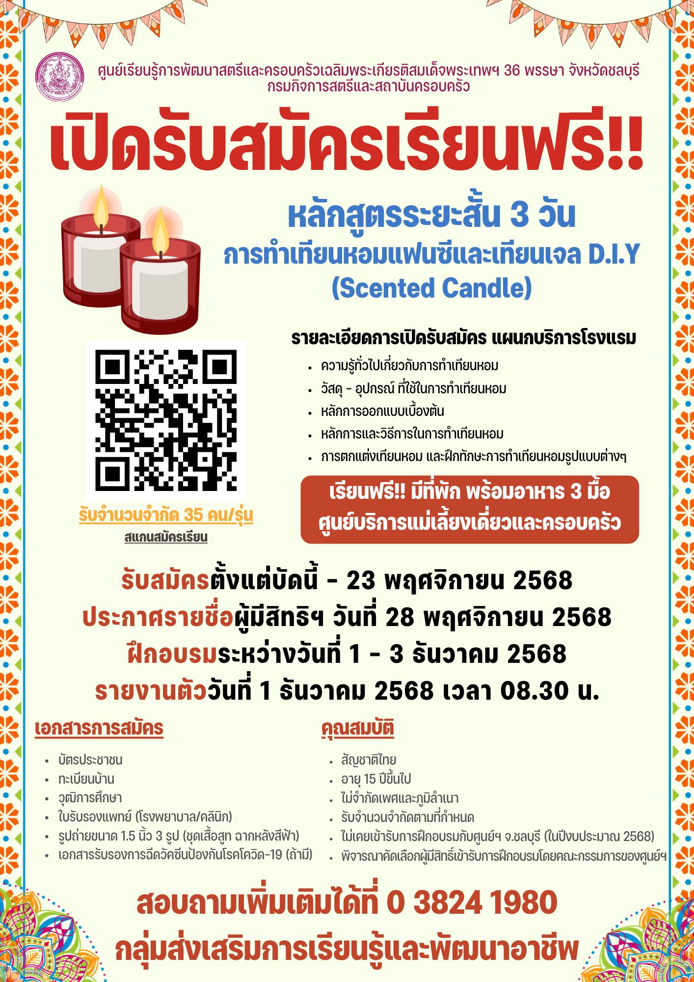 รายละเอียดการเปิดรับสมัคร แผนกบริการโรงแรม หลักสูตรการทำเทียนหอมแฟนซีและเทียนเจล D.I.Y (Scented Candle) (รับจำนวน 35 คน/รุ่น)