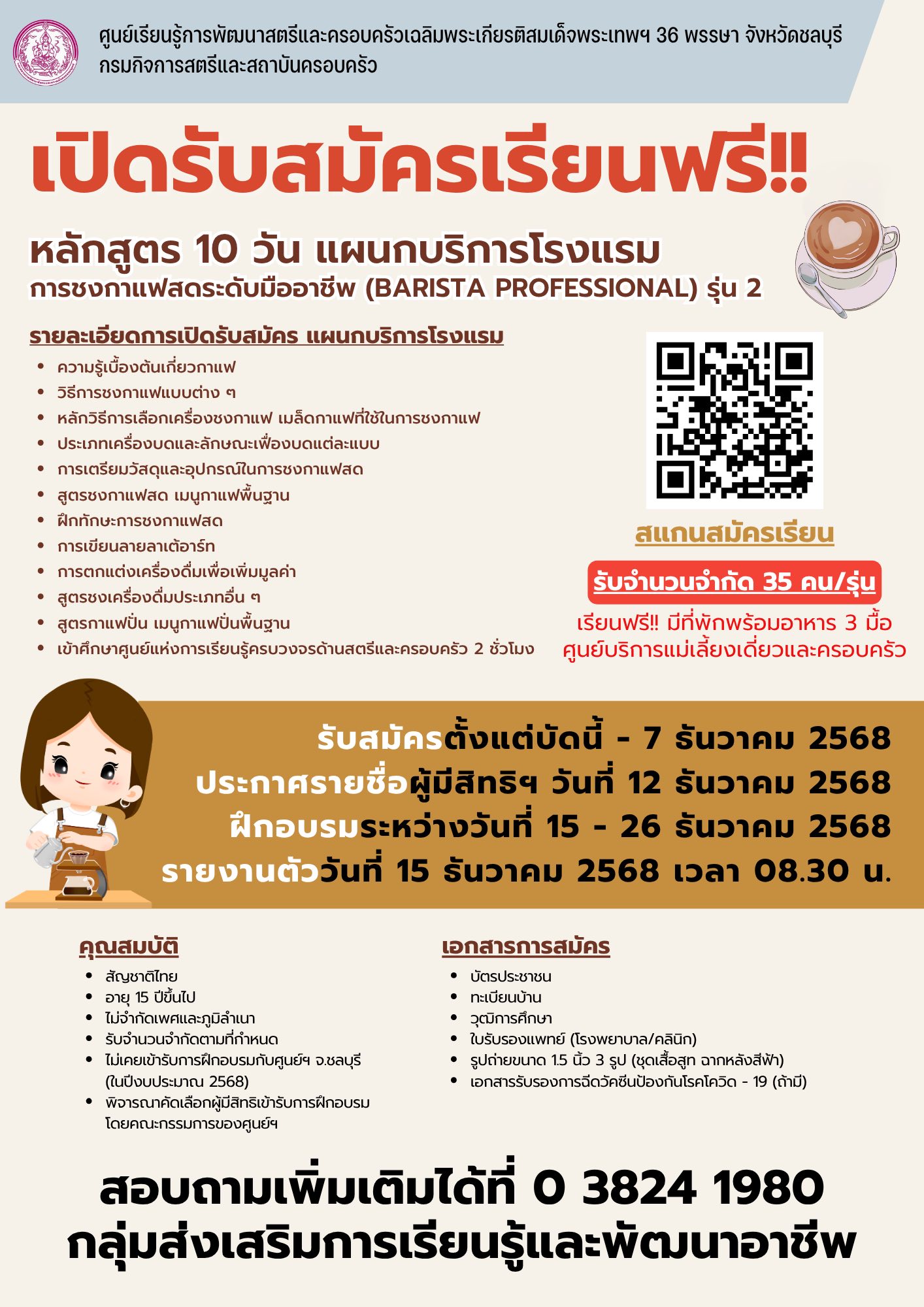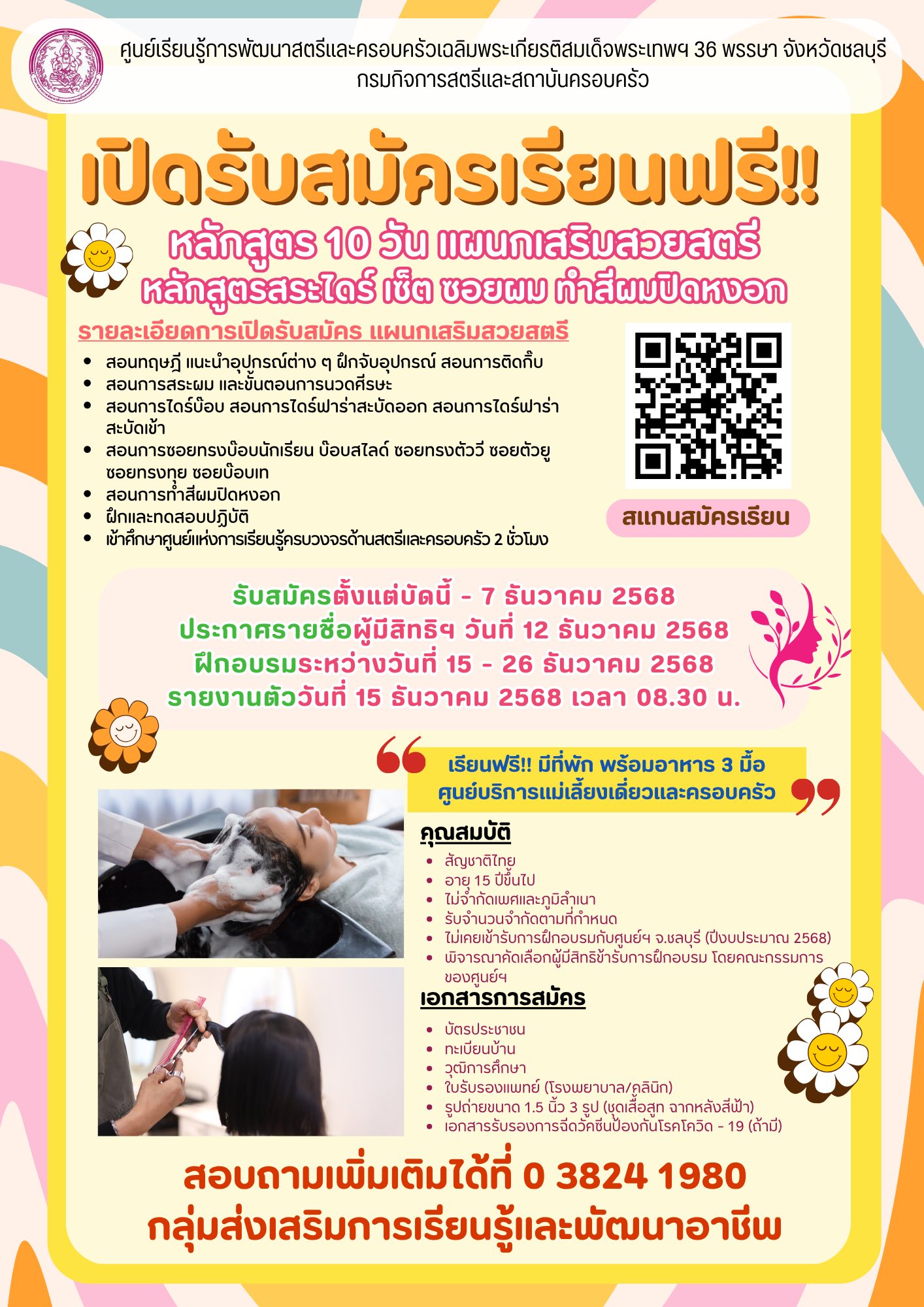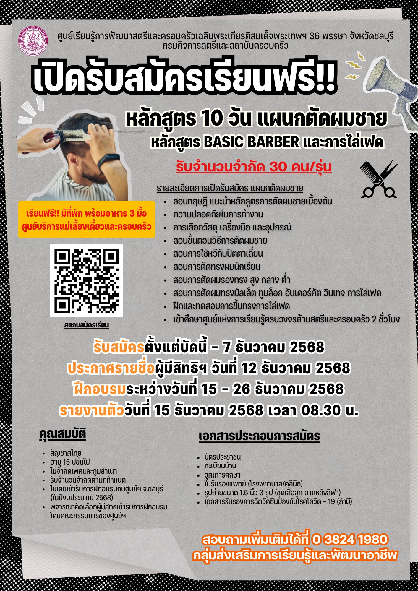 รายงานตัววันที่ 15 ธันวาคม 2568 เวลา 08.30 น. ณ อาคารอเนกประสงค์ฯ ศูนย์เรียนรู้การพัฒนาสตรีและครอบครัวฯ จังหวัดชลบุรี