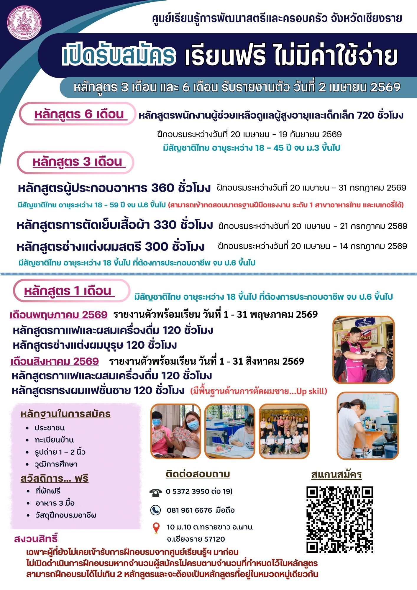 ทั้งนี้ ขอสงวนสิทธิ์เฉพาะผู้สมัครที่ยังไม่เคยเข้ารับการฝึกอบรมจากศูนย์เรียนรู้การพัฒนาสตรีและครอบครัว จังหวัดเชียงราย