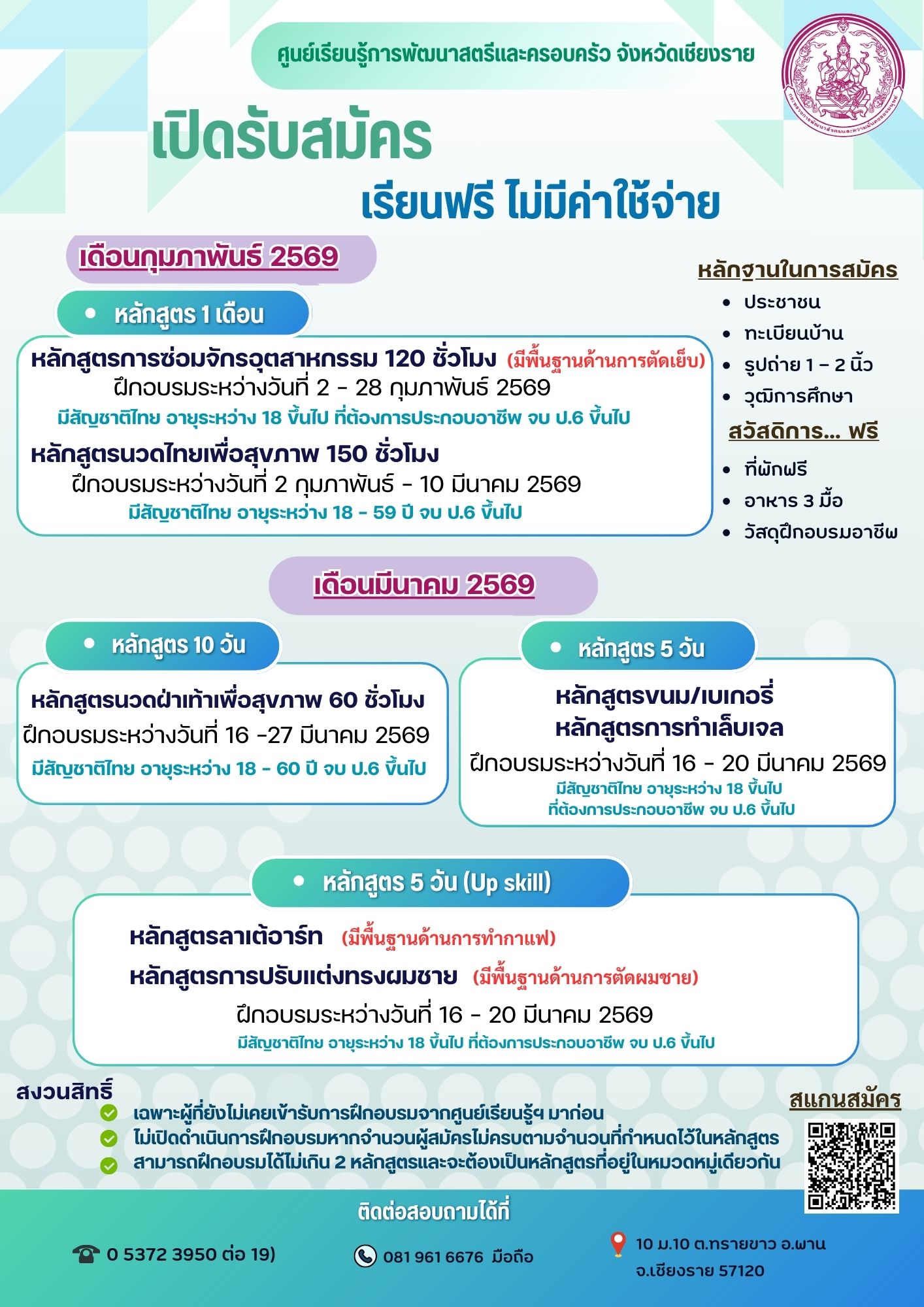 ทั้งนี้ ขอสงวนสิทธิ์เฉพาะผู้สมัครที่ยังไม่เคยเข้ารับการฝึกอบรมจากศูนย์เรียนรู้การพัฒนาสตรีและครอบครัว จังหวัดเชียงราย