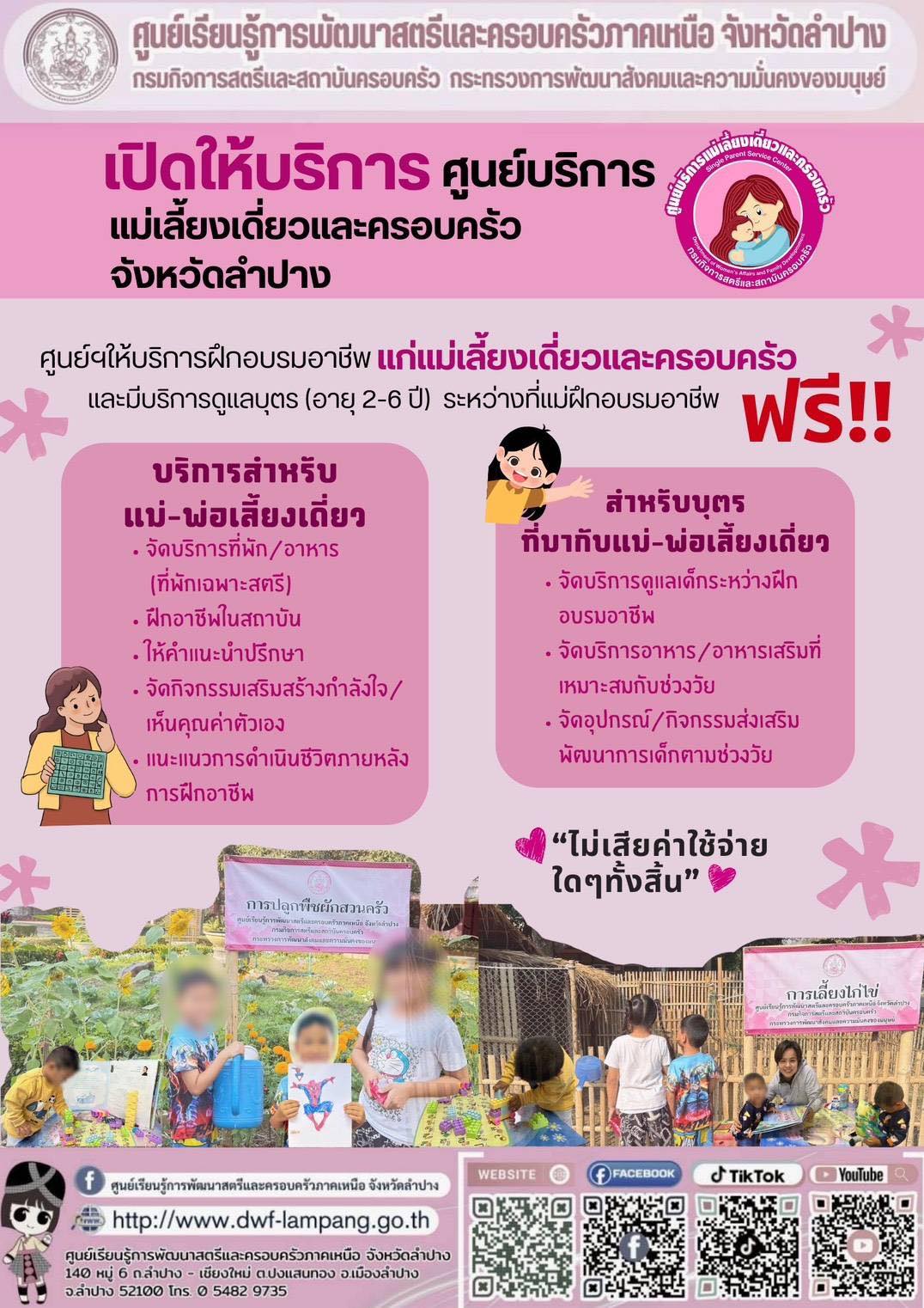 ประชาสัมพันธ์ ปิดเทอมนี้ สำหรับท่านใดที่เป็นแม่/พ่อเลี้ยงเดี่ยว หรือครอบครัวที่ว่างงาน หรืออยากฝึกอาชีพ แต่มีบุตร หลาน อายุ 2-6 ปี ที่อยู่ในความดูแล ทางศูนย์เรียนรู้การพัฒนาสตรีและครอบครัวภาคเหนือ จังหวัดลำปาง เรามีนักสังคมคอยดูแล มีสวัสดิการ การให้คำปรึกษา และบริการให้ความช่วยเหลือ ณ ศูนย์บริการแม่เลี้ยงเดี่ยวและครอบครัว จังหวัดลำปาง
