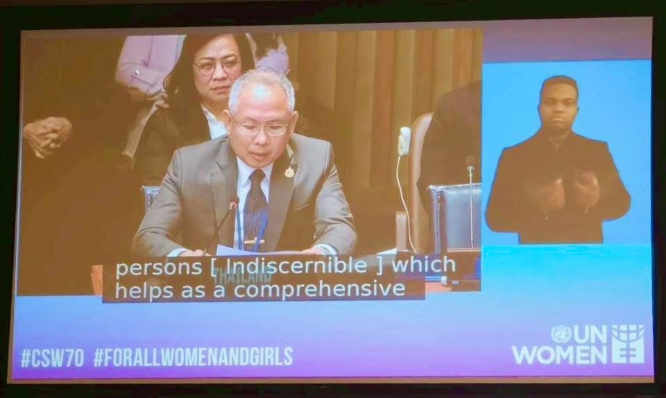 วันที่ 11 มี.ค.2569 เวลา 10.00 น. (ตามเวลาท้องถิ่น) ณ สำนักงานใหญ่สหประชาชาติ (UN) นครนิวยอร์ก สหรัฐอเมริกา นายกันตพงศ์ รังษีสว่าง ปลัดกระทรวงการพัฒนาสังคมและความมั่นคงของมนุษย์ ในฐานะหัวหน้าคณะผู้แทนไทย พร้อมด้วยนางจตุพร โรจนพานิช อธิบดีกรมกิจการสตรีและสถาบันครอบครัวและคณะ เข้าร่วมการประชุมโต๊ะกลมระดับรัฐมนตรีหัวข้อ การบรรลุความเสมอภาคระหว่างเพศและการเสริมพลังให้แก่สตรีสูงวัยทุกคน (Ministerial round tables on the emerging issue/focus area : Achieving gender equality and the empowerment of all older women) ในการประชุมคณะกรรมาธิการว่าด้วยสถานภาพสตรี สมัยที่ 70 (CSW70)
