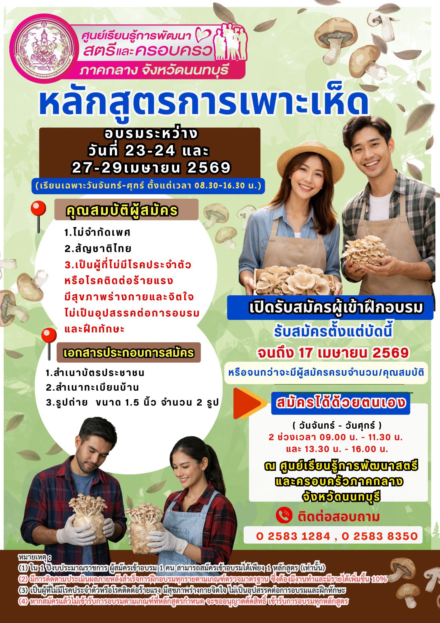 เปิดรับสมัครหลักสูตรระยะสั้น 30 ชั่วโมง (5 วัน) รุ่นที่ 3/2569 (การเพาะเห็ด) จำนวน 20 คน