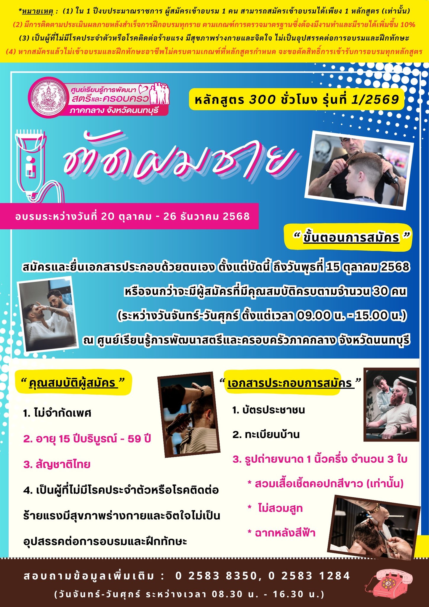 เปิดรับสมัครหลักสูตร 300 ชั่วโมง รุ่นที่ 1 ประจำปีงบประมาณ 2569 (ตัดผมชาย) จำนวน 30 คน