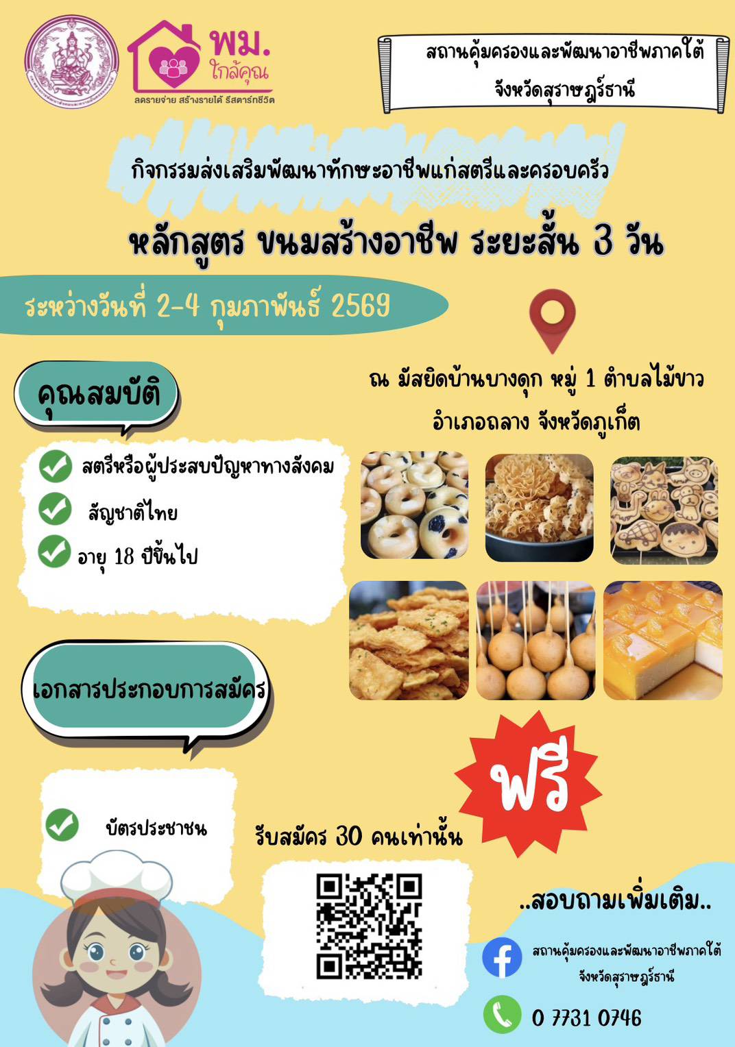 ฟรีไม่มีค่าใช้จ่าย หลักสูตร ขนมสร้างอาชีพ ณ มัสยิดบ้านบางดุก หมู่ 1 ตำบลไม้ขาว อำเภอถลาง จังหวัดภูเก็ต ระหว่างวันที่ 2 - 4 กุมภาพันธ์ 2569 รับจำนวนจำกัด 30 คนเท่านั้น