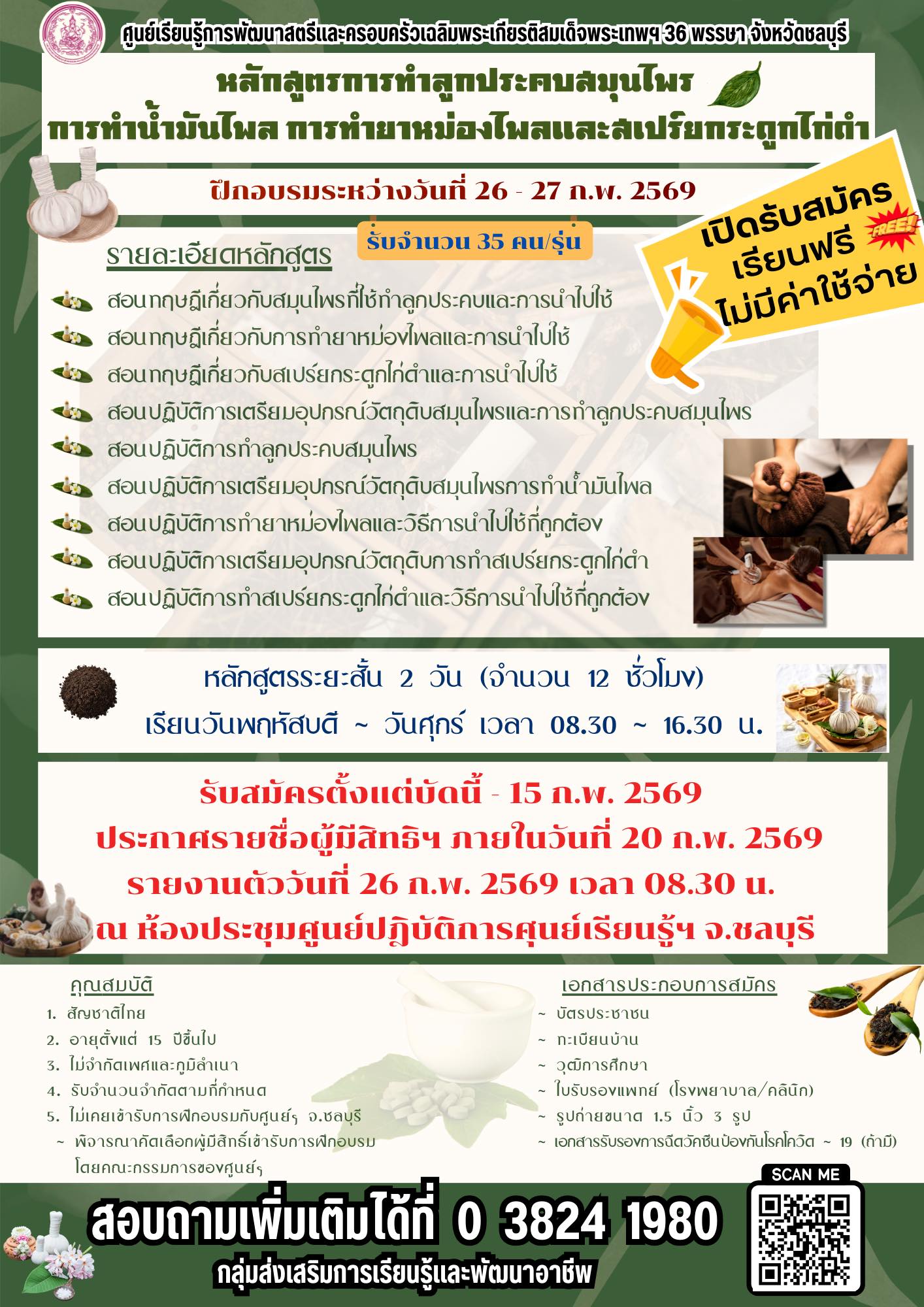 หลักสูตรการทำลูกประคบสมุนไพร การทำน้ำมันไพล การทำยาหม่องไพลและสเปร์ยกระดูกไก่ดำ (รับจำนวน 35 คน/รุ่น) ![]()