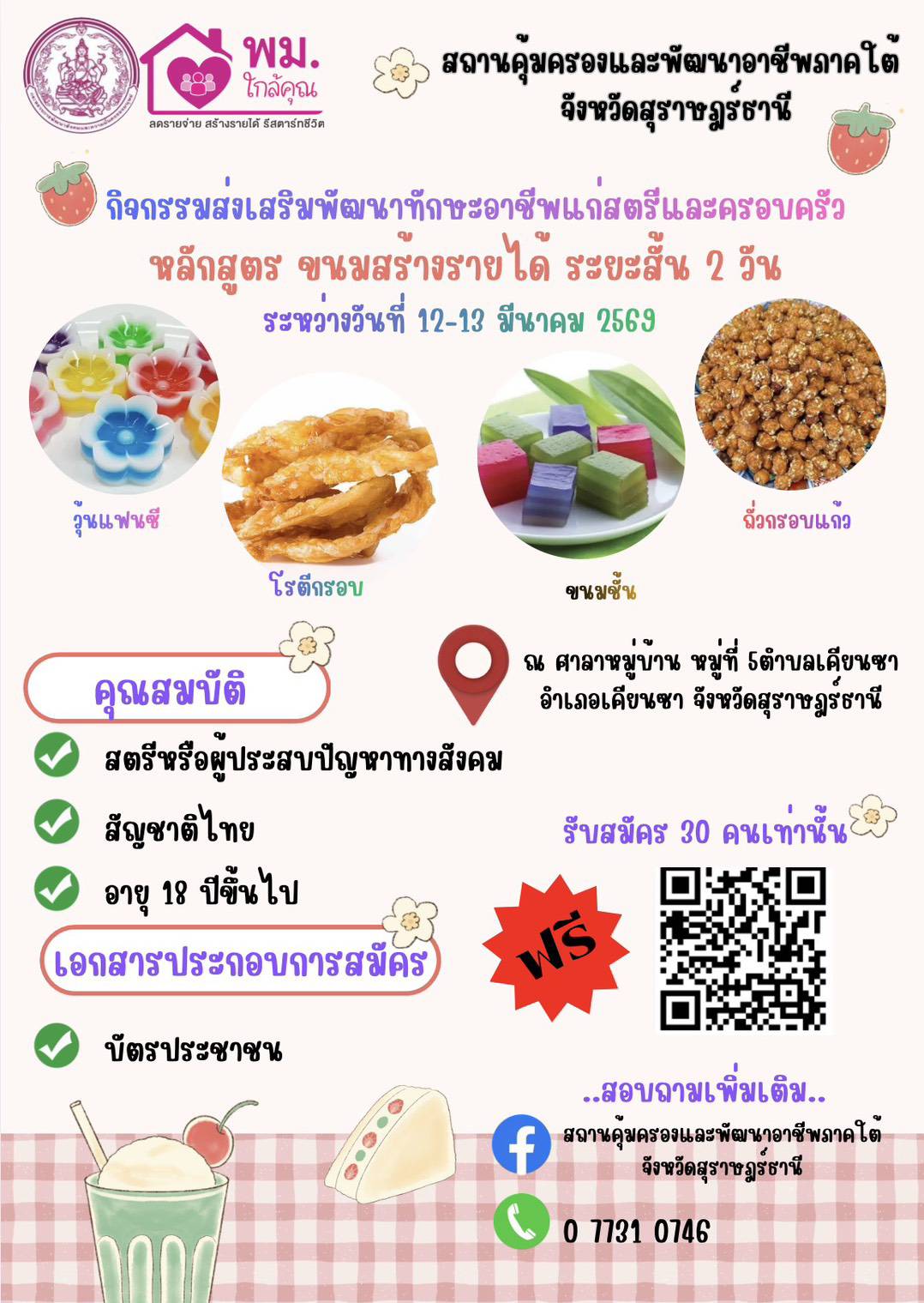 ฟรีไม่มีค่าใช้จ่าย หลักสูตร ขนมเบเกอรี่ ระยะสั้น 2 วัน ณ ระหว่างวันที่ 19 - 20 กุมภาพันธ์ 2569 จำนวน 30 คนเท่านั้น
