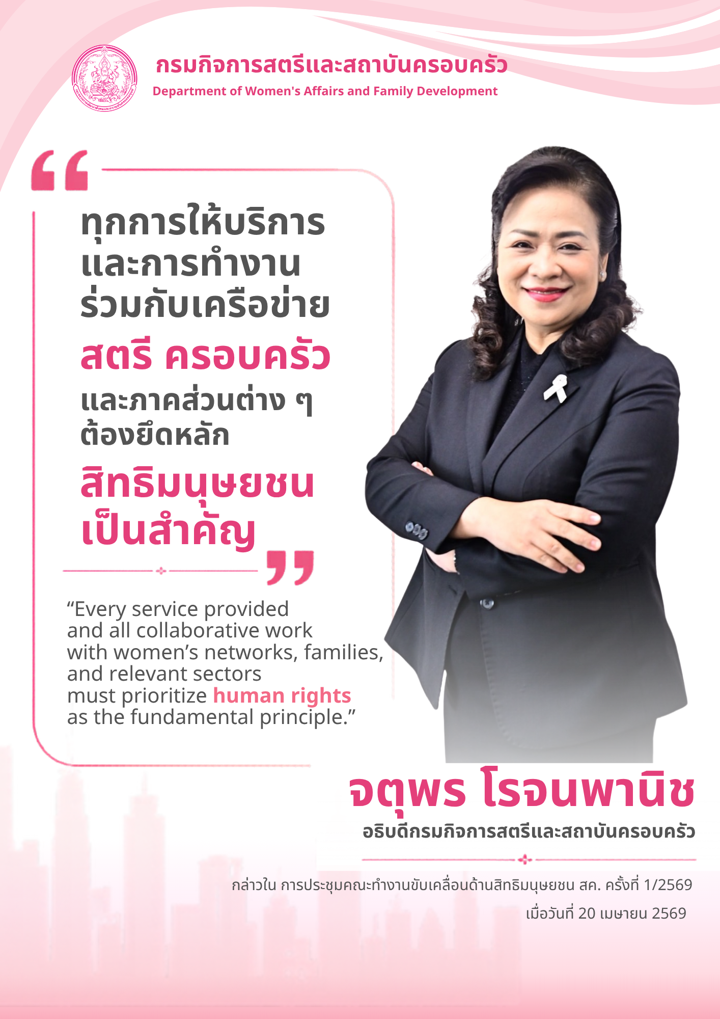 ยึดมั่นหลักสิทธิมนุษยชนเป็นสำคัญในการดำเนินงานทุกมิติ ทั้งการให้บริการประชาชนและการทำงานร่วมกับเครือข่ายสตรี ครอบครัว และภาคส่วนที่เกี่ยวข้อง